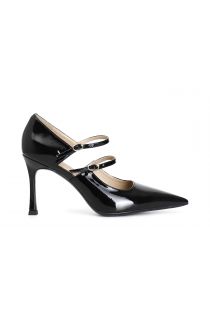 Patent pumps with an elegant and feminine style. shoe enriched with double strap and buckle. fine heel 87 mm high. slim shape. lining and insole are in leather.