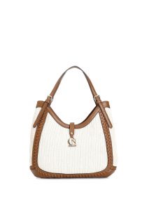 Raffia shoulder bag with elegant contrasting finishes adjustable handles with buckle and metal charm. perfect for a chic and functional summer look.