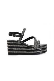 Sandals with rhinestone bands. wedge characterised by alternating bands of rhinestones. the comfortable padded genuine leather insole makes the shoe comfortable even after several hours of use. the heel is 70mm high the platform is 35mm.