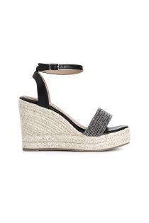 Sandals with rhinestone bands on a cord wedge and platform. ankle strap.
