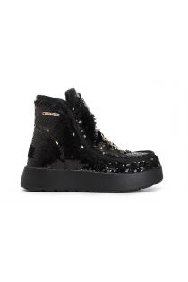 Sequin fabric ankle boots with faux fur lining. Metal logo and elevated sole. The trim is embellished with visible stitching.