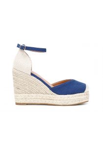 Shoes with ankle strap in lace fabric on cord wedge h90mm