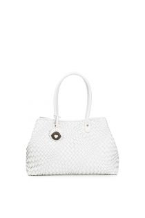 Open shopper with inner string embellished by irregular sized crossover feature and tubular handles. Custom pendant accessory