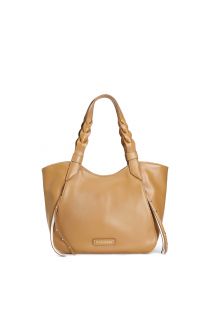 Soft shopping bag with side pockets and two-tone zip puller decorated with rivets woven handles and logo on metal patch. zip closure for style and convenience.