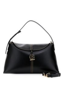 Faux leather shoulder bag with a flap finished with contrasting stitching and a metal pendant with a gold logo. It features a removable shoulder strap for practical and versatile use.