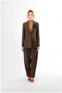 Oversized single-breasted jacket with peak collar made of bi-stretch fabric. elegant flower brooch. timeless garment to combine with a pair of skinny or flared trousers.