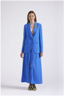 Single-breasted jacket made of a cool linen-blend fabric. the jacket is embellished with a delicate removable crocheted flower accessory. gold button fastening and welt pockets with flaps.