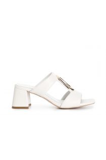 Slipper with double band and decorated metal accessory. the padded insole in real leather makes the shoe comfortable even after several hours of use. the heel is 6 cm.