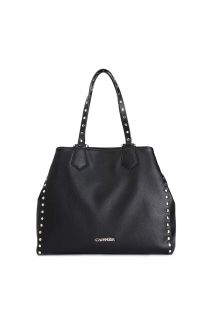 Soft shopping bag with rivet application and metal handle attachments. super roomy with double portability (strap with internal button). single compartment with internal zipped pocket. zipper closure.