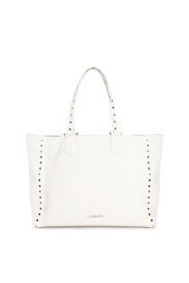 Soft shopping bag with rivet application and metal handle attachments. super roomy with double portability (strap with internal button). single compartment with internal zipped pocket. zipper closure.