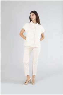 Spring down jacket with cap sleeves made of impalpable nylon with a shiny finish. horizontal quilting. button closure.