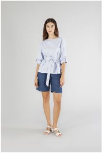 Blouse with bateau neckline made of striped stretch poplin. fabric sash to tie at the waist and the long sleeves can be rolled up and fastened with a button. perfect for completing elegant looks combined with collection items.