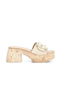 Suede and raffia slipper with buckle. the heel is 7 cm high.