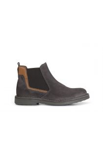 Men's suede ankle boot with side stretch panel and leather trim. upper stitched to the sole. leather insole.