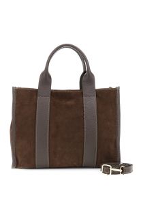 Suede bag with hammered leather handles and details, a metal logo on the front, and a removable shoulder strap. Elegance and functionality in a chic everyday accessory.
