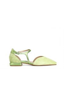Suede ballet flats with asymmetrical ankle lace-up in patent effect. 15mm-high patent leather heel.