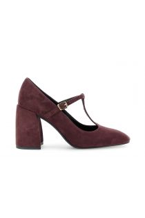 Suede pumps with a T-strap and gold buckle on a leather insole for superior comfort. An 8.5 cm block heel for stable and refined elegance.