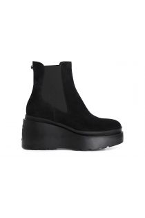 Women's suede ankle boot with stretch panels. leather insole and wedge sole customised with embossed logo on the back.