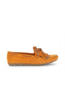 Suede moccasins with contrasting stitching and fringe. decorative studs leather lining and insole. a perfect blend of comfort artisanal details and contemporary boho style.