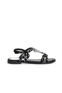Suede sandals with studs and seahorse-shaped accessory with rhinestone studs and pearls. lining and insole are in leather. the heel is 2 cm high. comfortable to wear and easy to match.