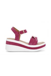 Suede sandals with rhinestone accessory. comfortable wide wedge with a padded insole clad with napa leather. adjustable buckle strap at the ankle.