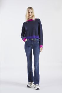 Warm and enveloping boat neck sweater and rear buttoning in a mix of colours and yarns