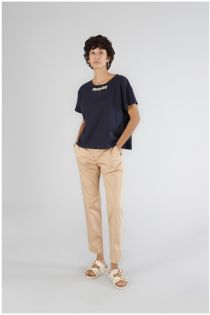 Crew-neck and short-sleeved t-shirt made of cotton jersey. model with rhinestone application to decorate the neckline.