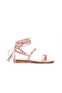 Leather t-strap with studs on the profiles, on a medium wedge decorated with a patchwork pattern
