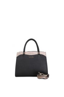 Rigid satchel in Saffiano leather with curvilinear detailing on the front.