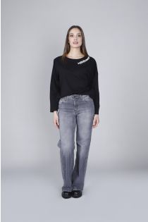 wide leg denim jeans with rhinestones on the sides grey