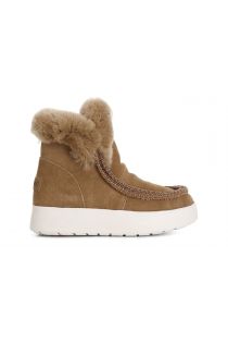 Women's suede ankle boot with moccasin edge and ornamental cross stitching. the lining and insole are made of synthetic fur. warm and very comfortable shoe. ideal for cold winter days.