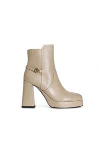 Women's ankle boot in imitation leather with particular cafènoir accessory. 22 mm platform and 100 mm high heel. rounded shape. internal zip on the inside of the shoe. the insole is in leather. all this gives balance between height beauty and comfort.