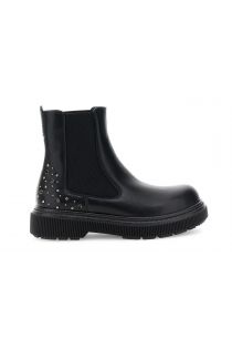 Women's faux leather ankle boots with elastic sides and chrome studs on the heel. Fabric lining and 4 cm sole. Perfect for a bold, urban chic look.