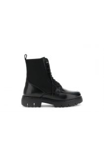 Women's leather ankle boot laced with rhinestone laces and elastic. the insole is in leather. 25 mm high plateau. 40mm heel.