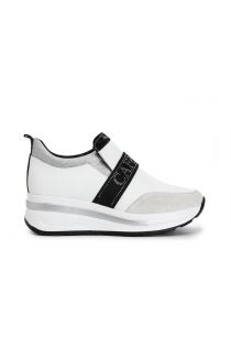 Women's leather slip-on enriched with glitter details and a pretty band with a rhinestone cafènoir logo. two-tone raised sole with embossed logo.