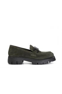 Women's suede moccasin with horsebit. lining and insole are in leather. 25 mm high plateau. 40mm heel.