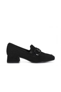 Women's suede moccasin with horsebit. the insole is in leather. 40 mm thick heel.