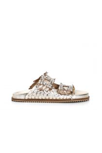 woven leather slipper with double jewel buckle light gold