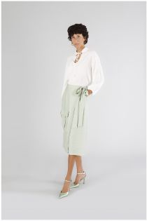 Below-the-knee wallet-style skirt with maxi side pocket in flowing flowing fabric. a touch of femininity and playfulness to your wardrobe thanks to the side bow detail. perfect model for those who want to express creativity and originality on every occasion.